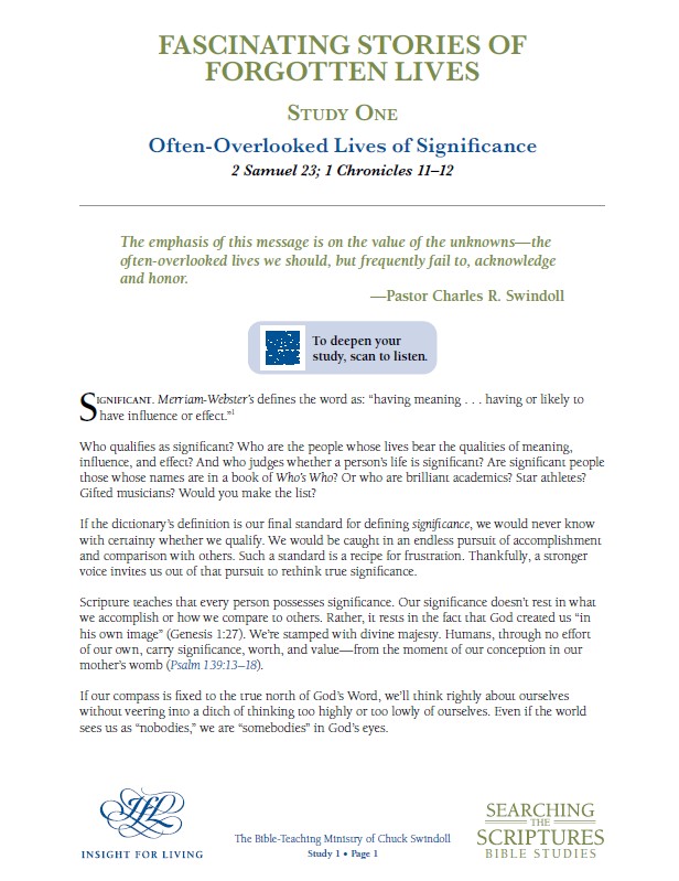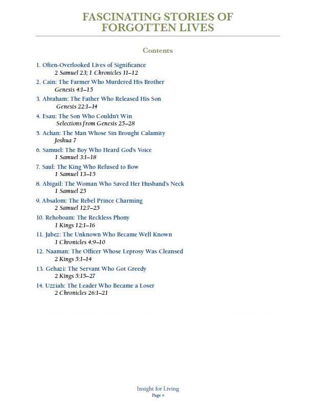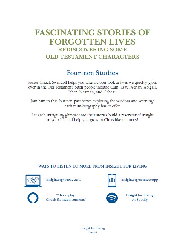Pastor Chuck Swindoll helps you take a closer look at lives we quickly gloss over in the Old Testament. Such people include Cain, Esau, Achan, Abigail, Jabez, Naaman, and Gehazi.