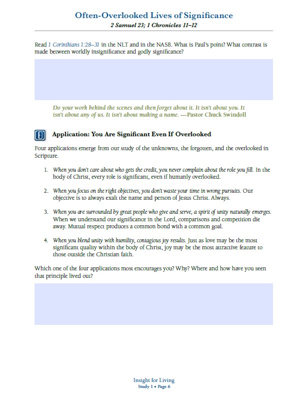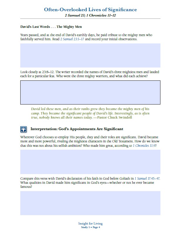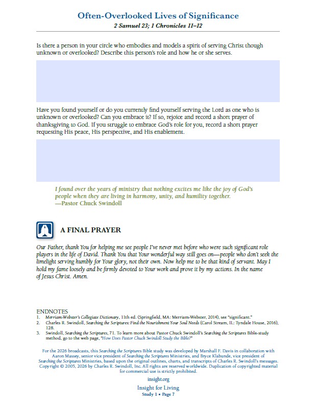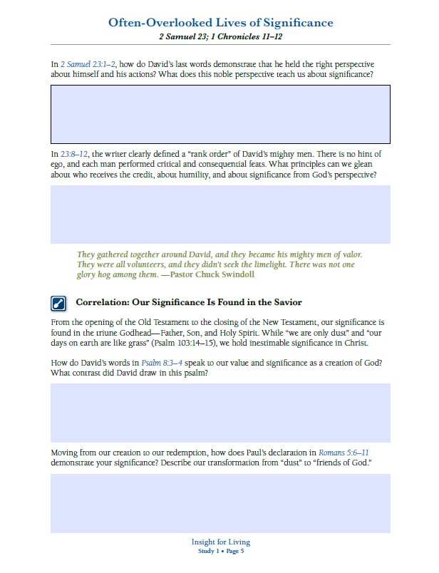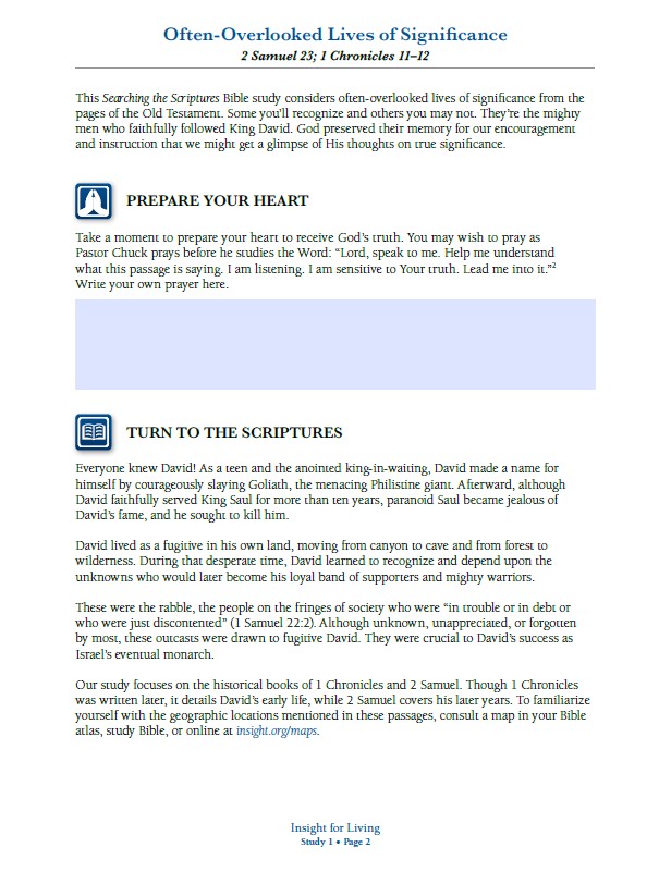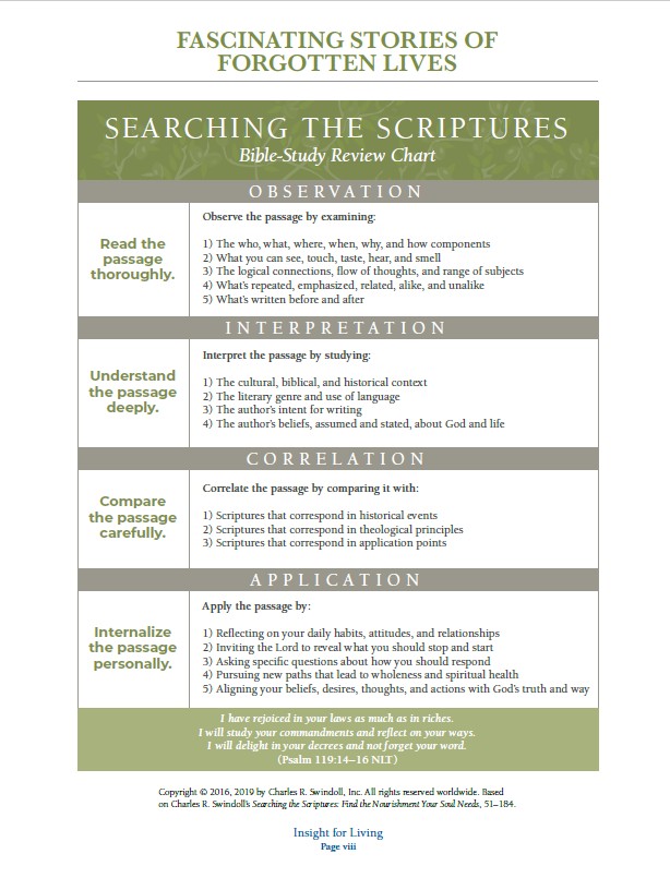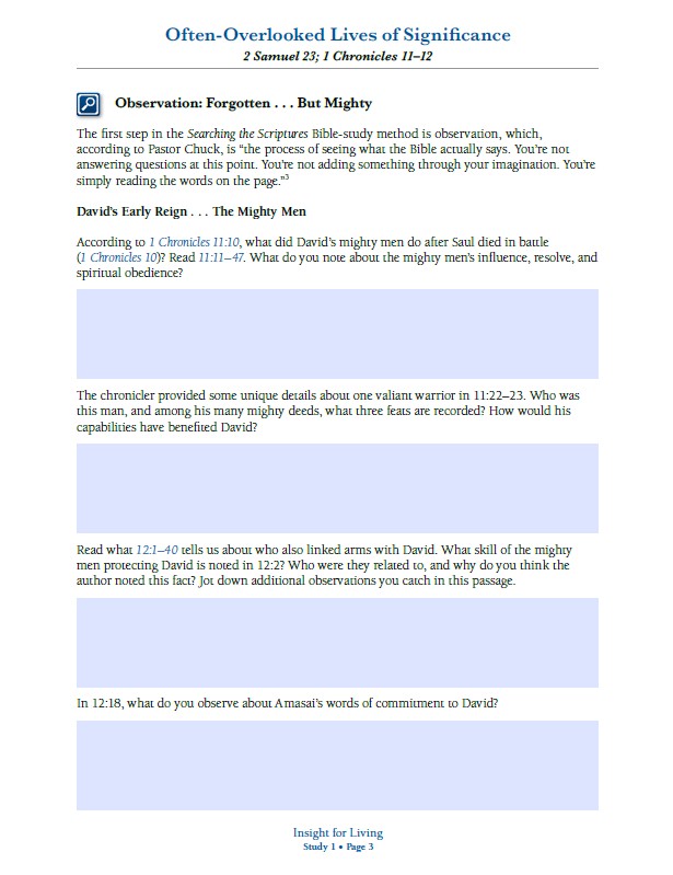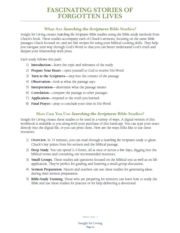 Insight for Living Ministries is excited to launch a new generation of freshly designed Searching the Scriptures Bible studies! These workbooks now offer an overview of Chuck’s Bible-study method and come in a printer-friendly format. Plus, you now have the option to order this preprinted set as a spiral-bound workbook.